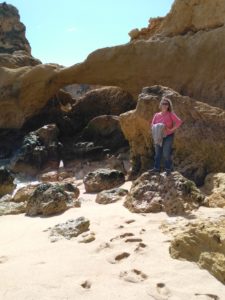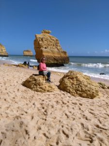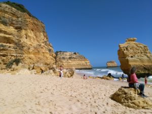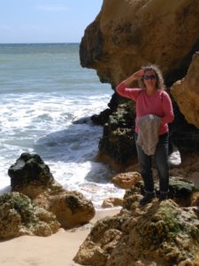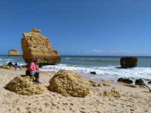 Yesterday, Sunday, we went out to another new beach, Praia Marinha, about 12 kilometers from our house. This first picture is taken from the higher cliff on the way back up. This beach is about 500 meters long and seems to attract lots of people. But right now in the off season (9 months per year) it is paradise for the residents. It was about 20 degrees temperature on that day. There are many such beaches located in between the inaccessible cliff beaches (except by boat) and they are simply fantastic.