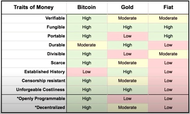 Another chart, showing the traits of money between bitcoin, gold and fiat.